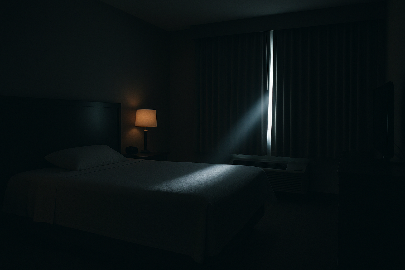 It turns out the parking lot below had massive security lights shining straight at the building — and we were unlucky enough to have the room that lined up with them perfectly.
