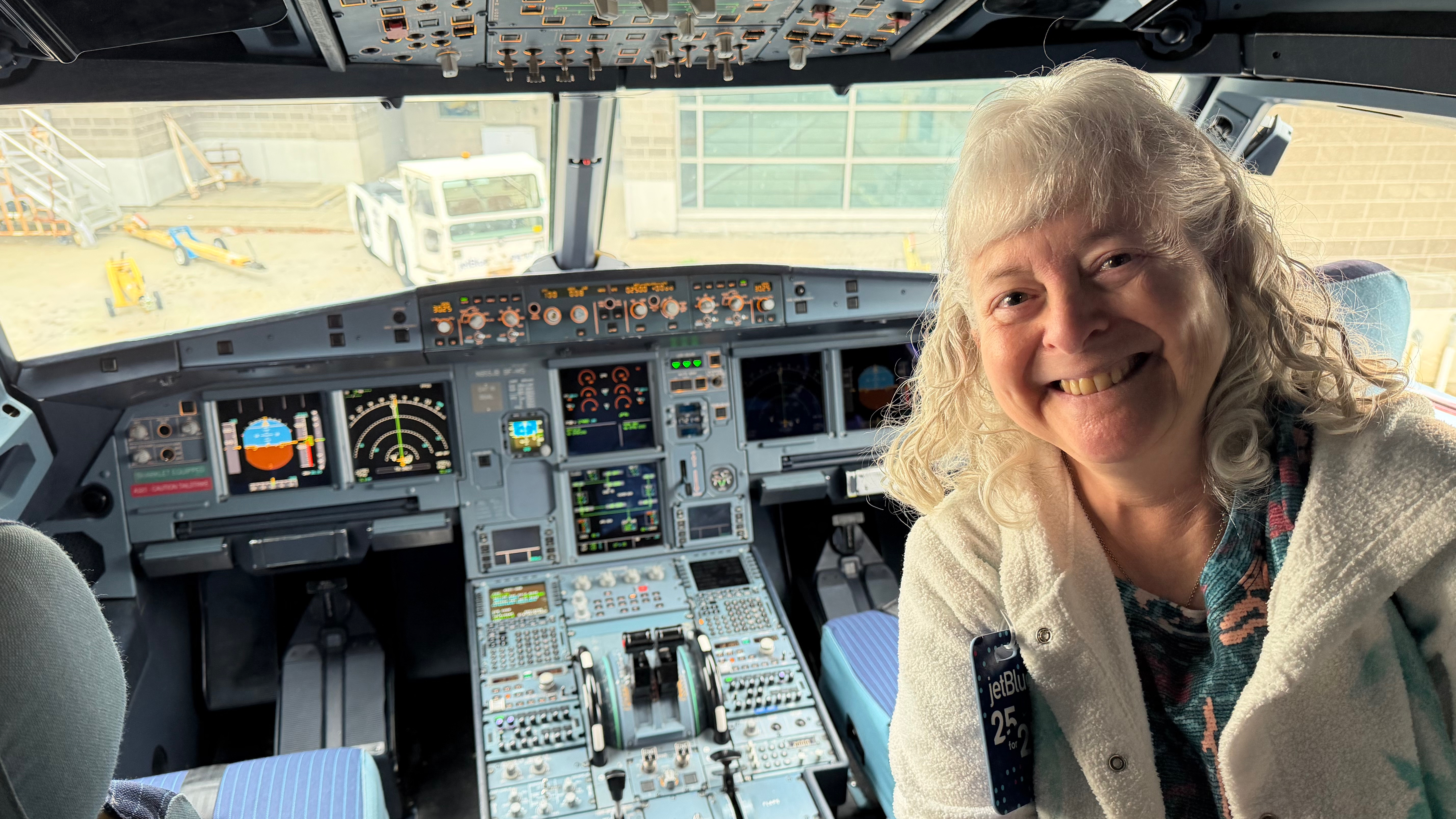 Before arrival, Sharon mentioned to the crew that this was City #25 and asked if she could grab a quick photo on the empty aircraft. They went above and beyond — they invited her to hop up front for a cockpit photo.