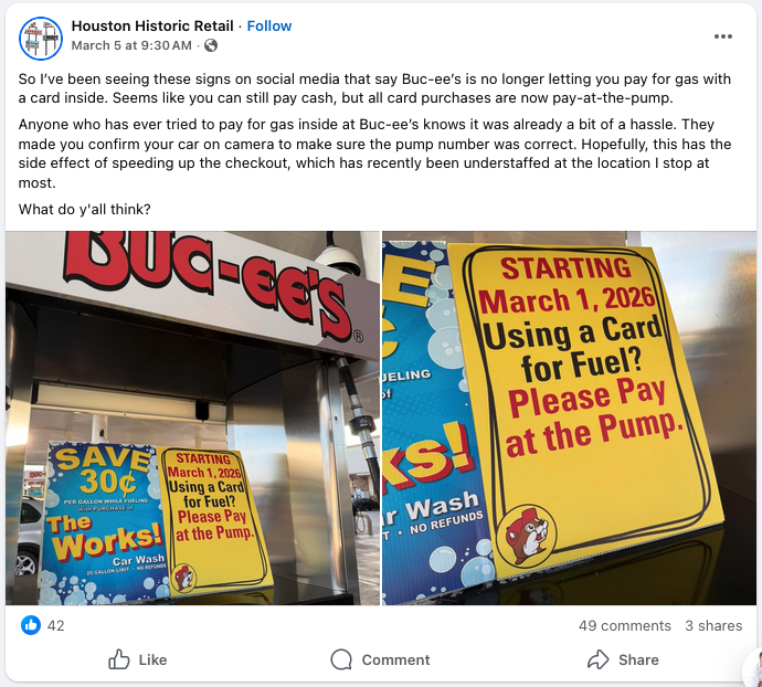 So I’ve been seeing these signs on social media that say Buc-ee’s is no longer letting you pay for gas with a card inside. Seems like you can still pay cash, but all card purchases are now pay-at-the-pump.