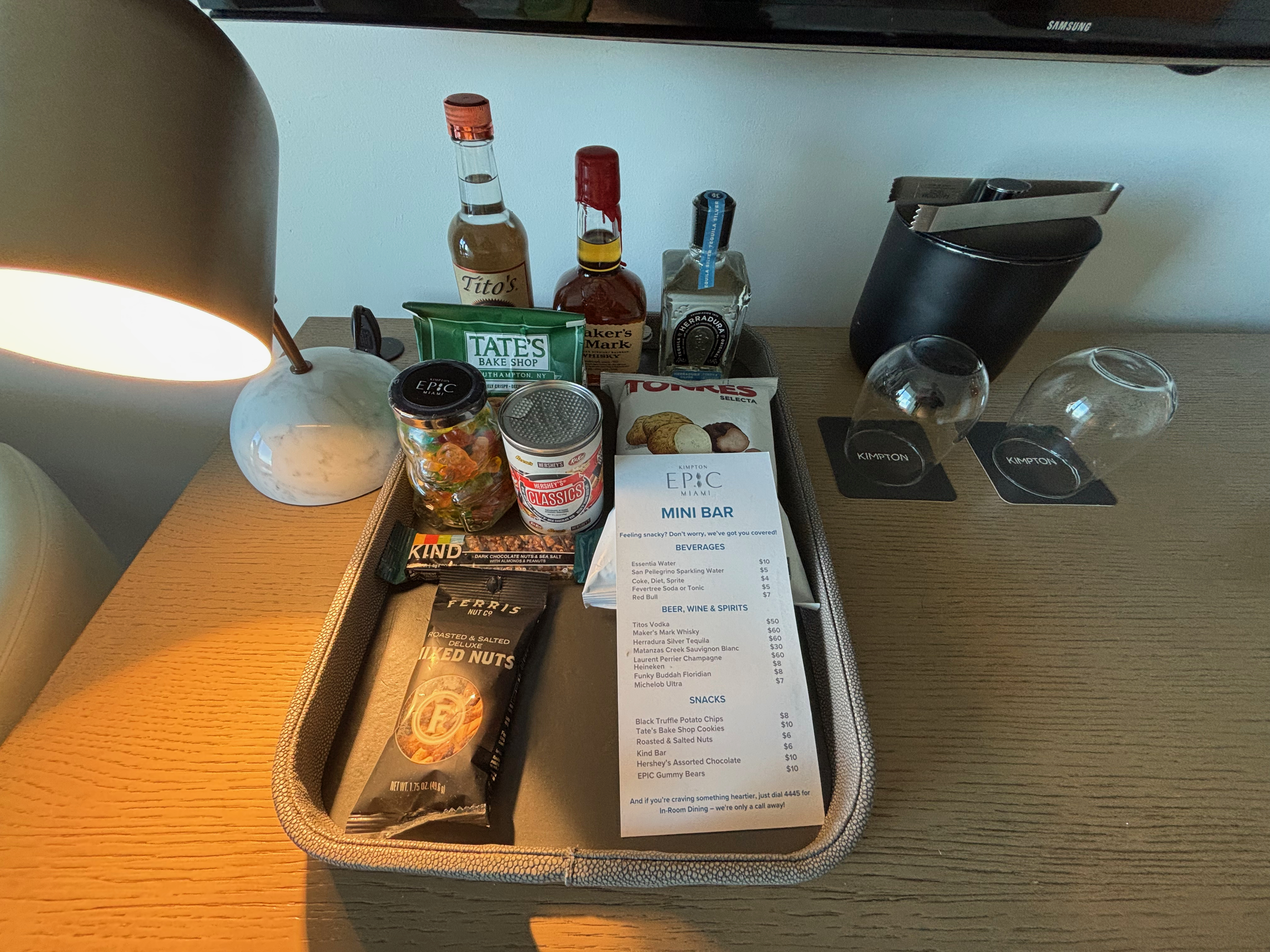 The minibar was fully stocked, as you’d expect in a hotel like this, with drinks and snacks displayed in a way that looked very nice and also served as a reminder that Miami minibar pricing remains undefeated. We admired it, then left everything exactly where it was.
