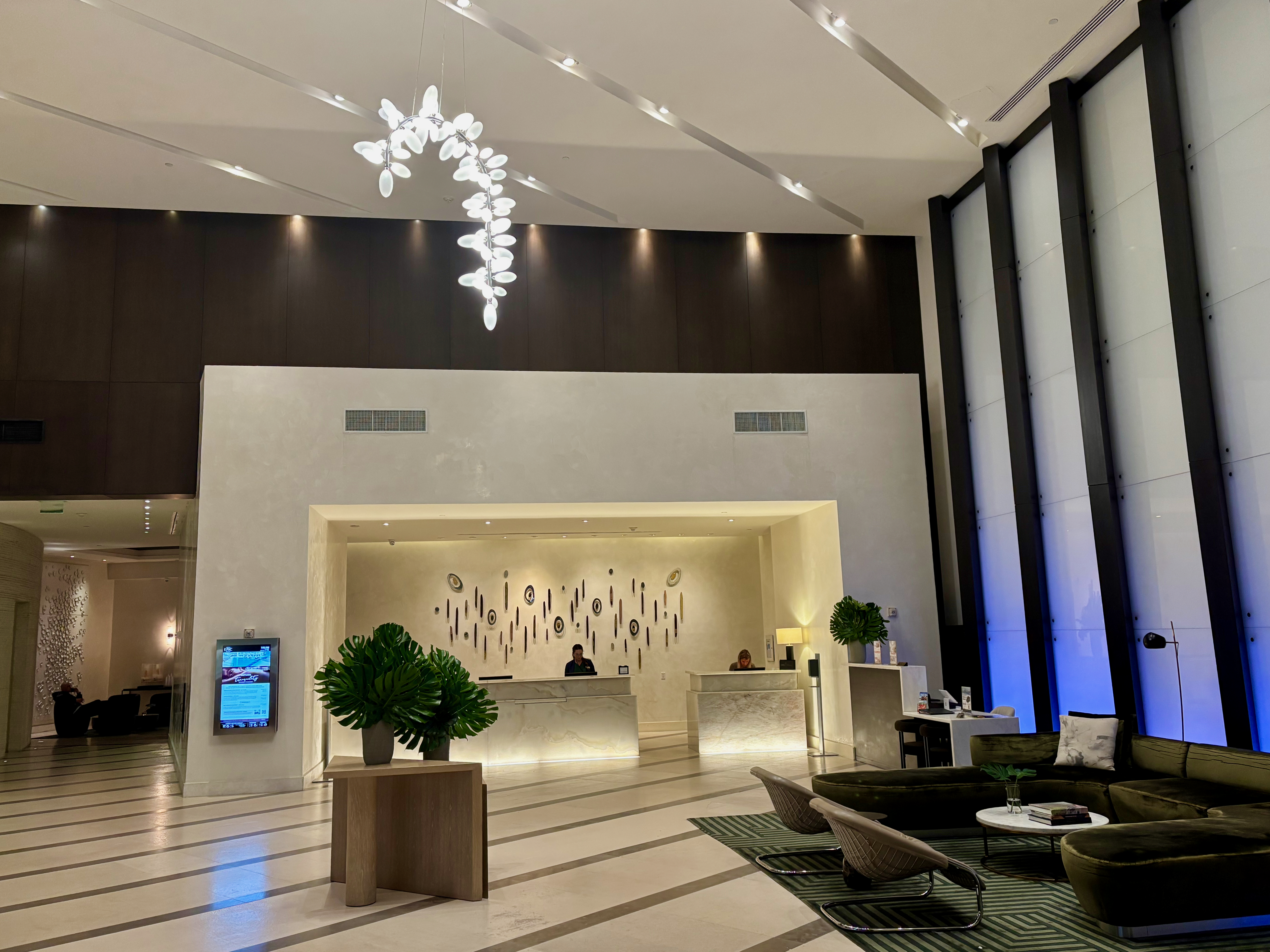 The hotel occupies only part of the building, with residences taking up the other floors, which gave the whole place a more polished, high-end vibe. The lobby had dramatic lighting, sleek finishes and the kind of design that made the property feel more like a destination hotel than just a place to sleep before getting on a ship.