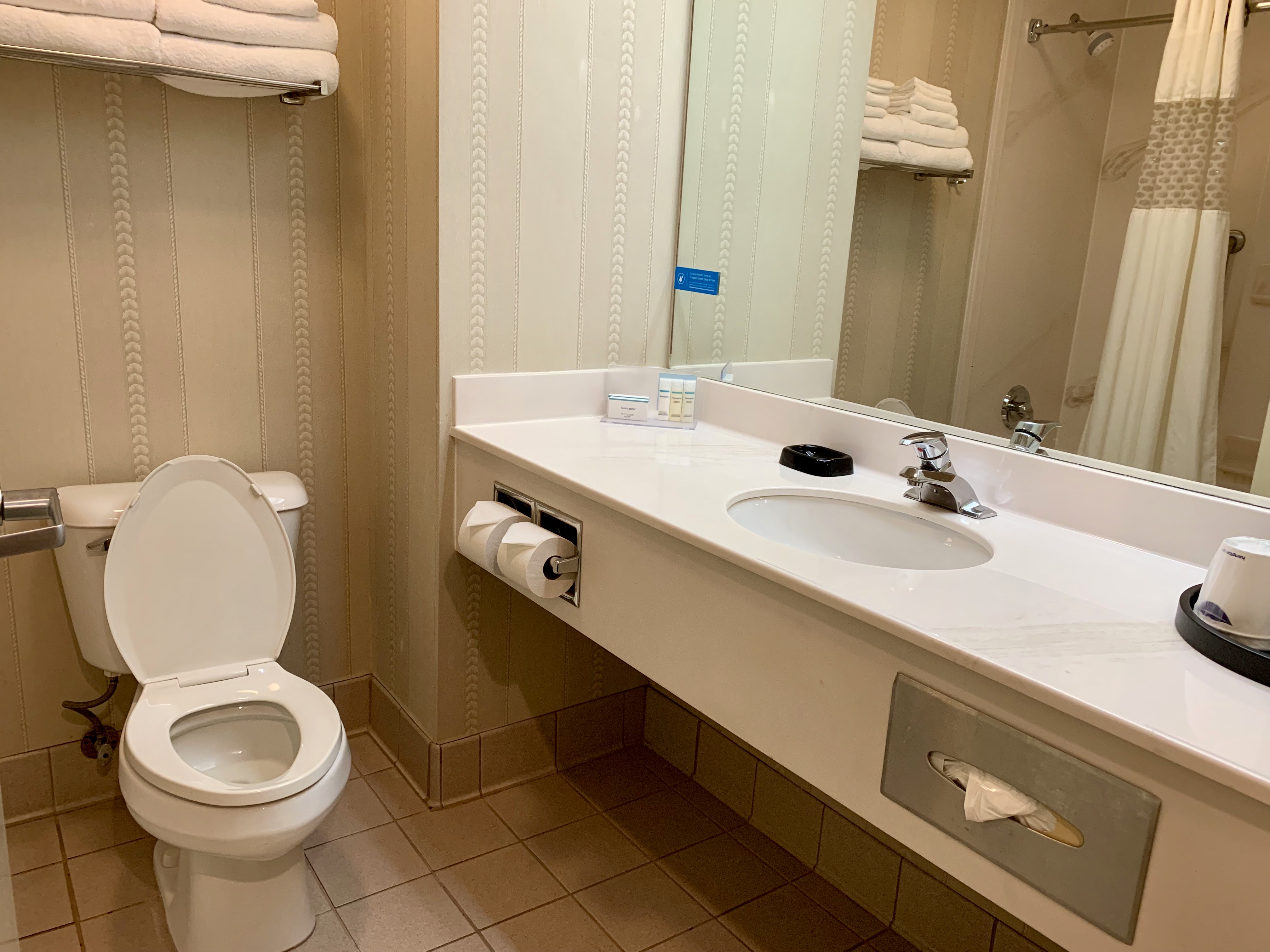The bathroom was exactly what you’d expect from a Hampton Inn. Bath/shower combo. Cheap plastic toilet seat. Lots of fluorescent lighting. Huge mirror against the wall and a selection of Neutrogena toiletries.