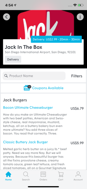 And then he had a choice of about a dozen restaurants and storefronts at SAN to choose from (AtYourGate can also deliver things from non-food establishments. So if, for an example, you’re having a makeup emergency, they can go to MAC for you):