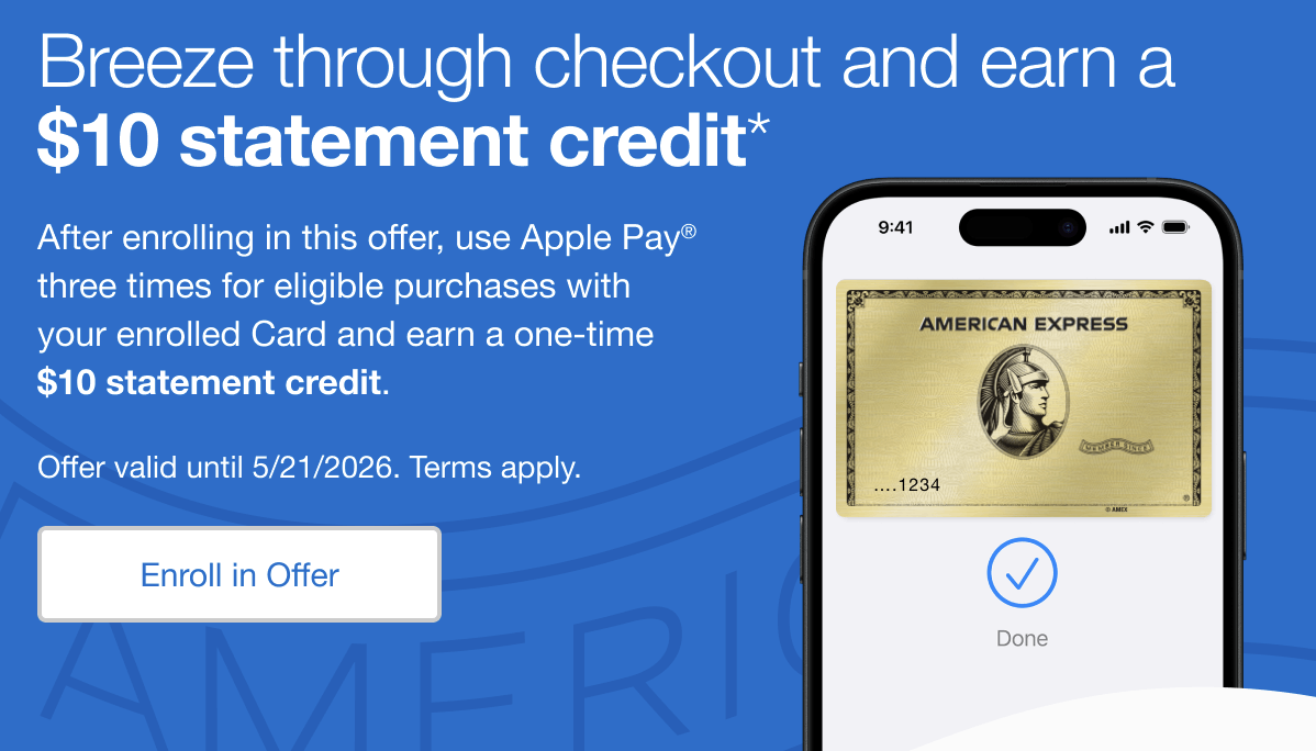 Both my wife Sharon and I received a new AMEX Offer that’s about as easy as they come. After enrolling, you’ll earn a one-time $10 statement credit when you use Apple Pay three times for eligible purchases by May 21, 2026.
