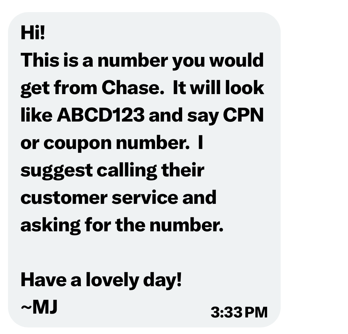 Their response pointed me in a completely different direction. They explained that I would need a coupon number (CPN) from Chase and suggested contacting Chase customer service to obtain it. That answer implied that the benefit wasn’t something Avis controlled directly, but rather something issued by the card issuer.