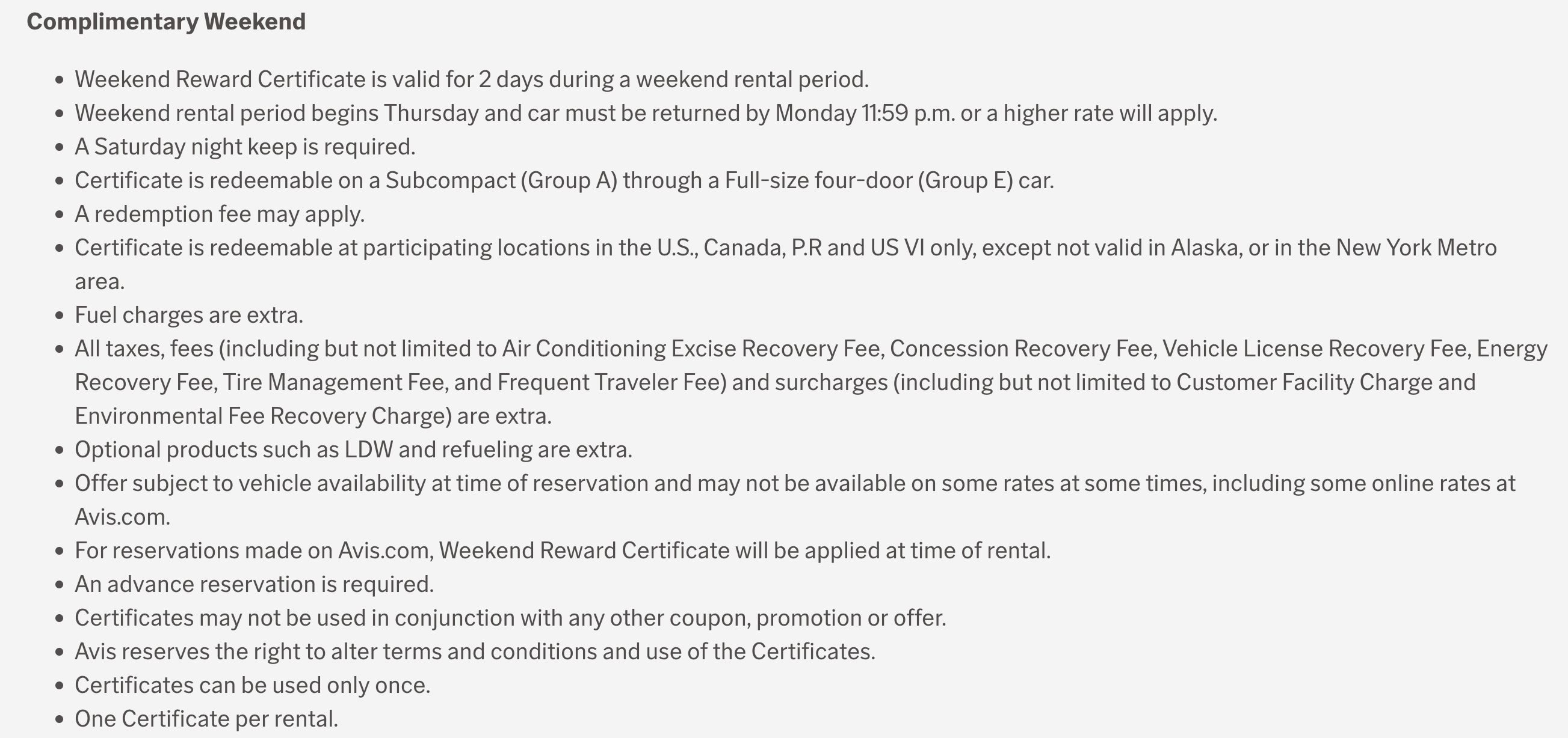 The key detail is that a “Weekend Reward Certificate will be applied at time of rental.” That sounds straightforward until you stop and think about it. If a certificate is required, then this isn’t a benefit you automatically receive just by holding a Visa Infinite card. You would need that certificate to exist in your Avis account first.