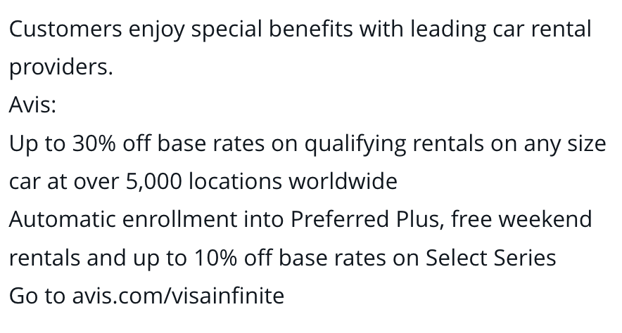 Instead, I received what was essentially a restatement of the marketing language. The response listed the standard Avis benefits—discounts, Preferred Plus status, and free weekend rentals—and then directed me back to the same Visa Infinite booking page on Avis’s website.